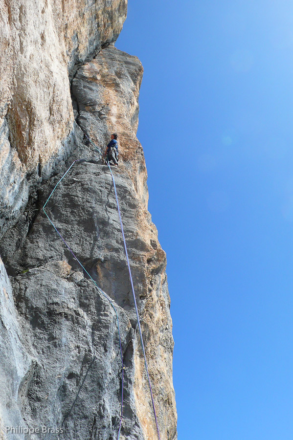 Courte certe, mais oh combien intense cette voie est une perle. Une gaterie au soleil à deux pas de la 'parete de parete' . Ouverte en solitaire par Domenico Bellenzier qui ne trouvait personne pour le suivre dans ses entreprises osées.
